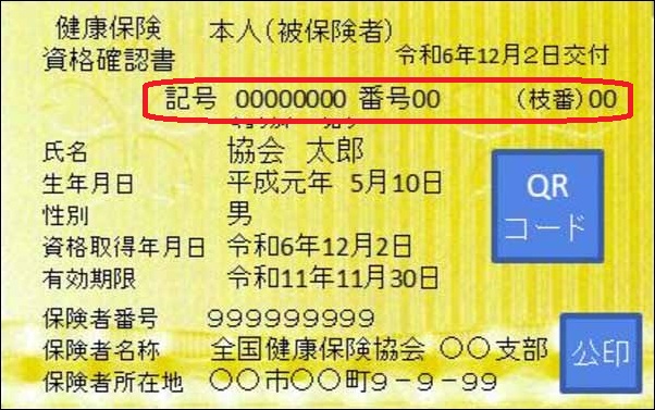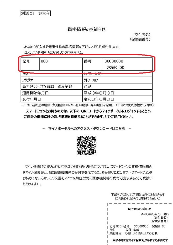 「資格確認書」または「資格情報のお知らせ」の例、赤枠部分の「記号」「番号」(「枝番」)をご確認ください。